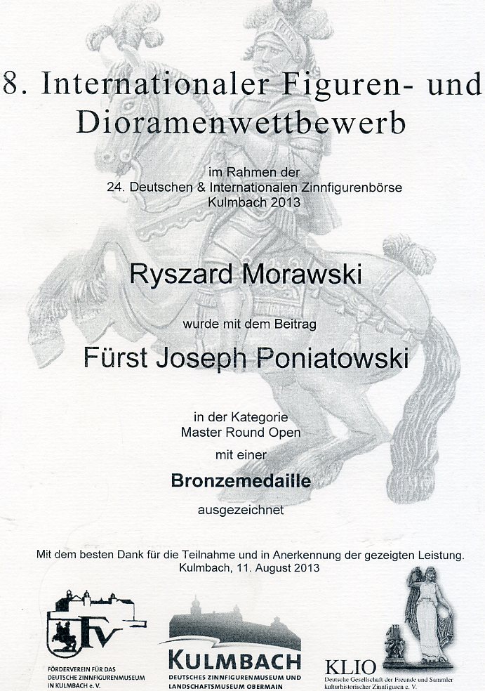 - dyplom potwierdzający nadanie brązowego medalu za figurkę księcia Józefa Poniatowskiego na wystawie w Kulmbach w roku 2013